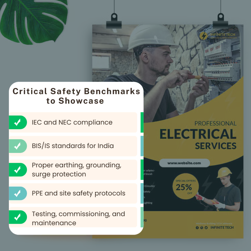 Your electrical company profile should include company background, services offered, certifications, safety standards, key projects, team expertise, client list, mission, vision, and complete contact information.